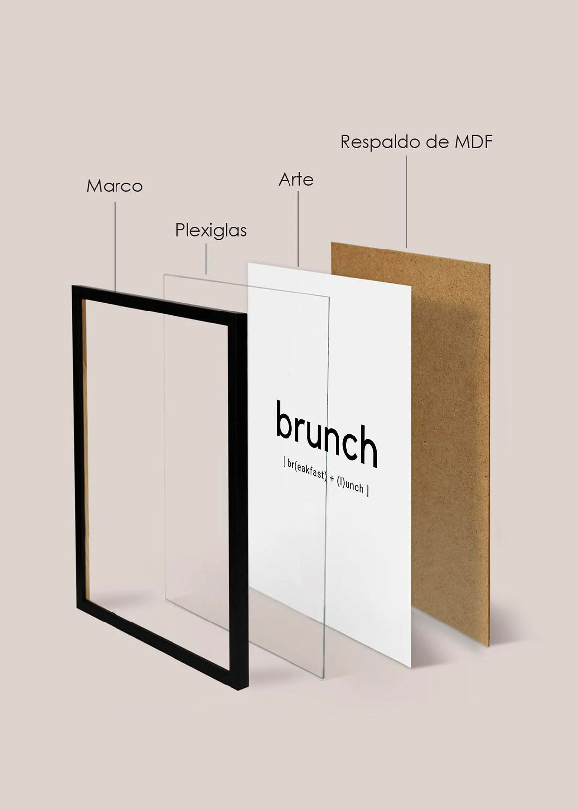 Utilizamos Impresíones de alta calidad enmarcada en marcos de madera y protegidas al frente por Plexiglas Cristalino y por el reverso con una placa de MDF.