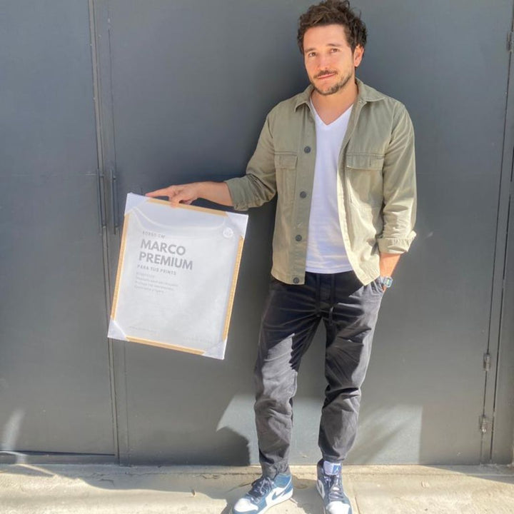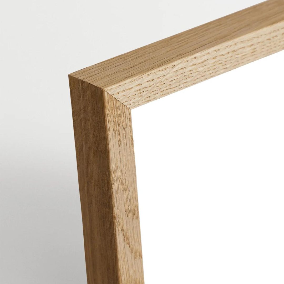 Utilizamos marcos de madera solida cortados con precisión por maquina para la creación de nuestros marcos. Actualmente están disponibles en diferentes acabados de madera, como negro, blanco y madera clara. Además, los marcos tienen caimanes de metal para colgarlos fácilmente.